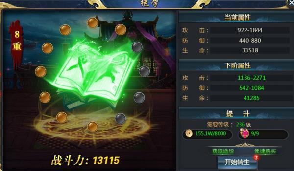 四、绝学:可以修炼绝学,提高人物转生等级,增强战斗力